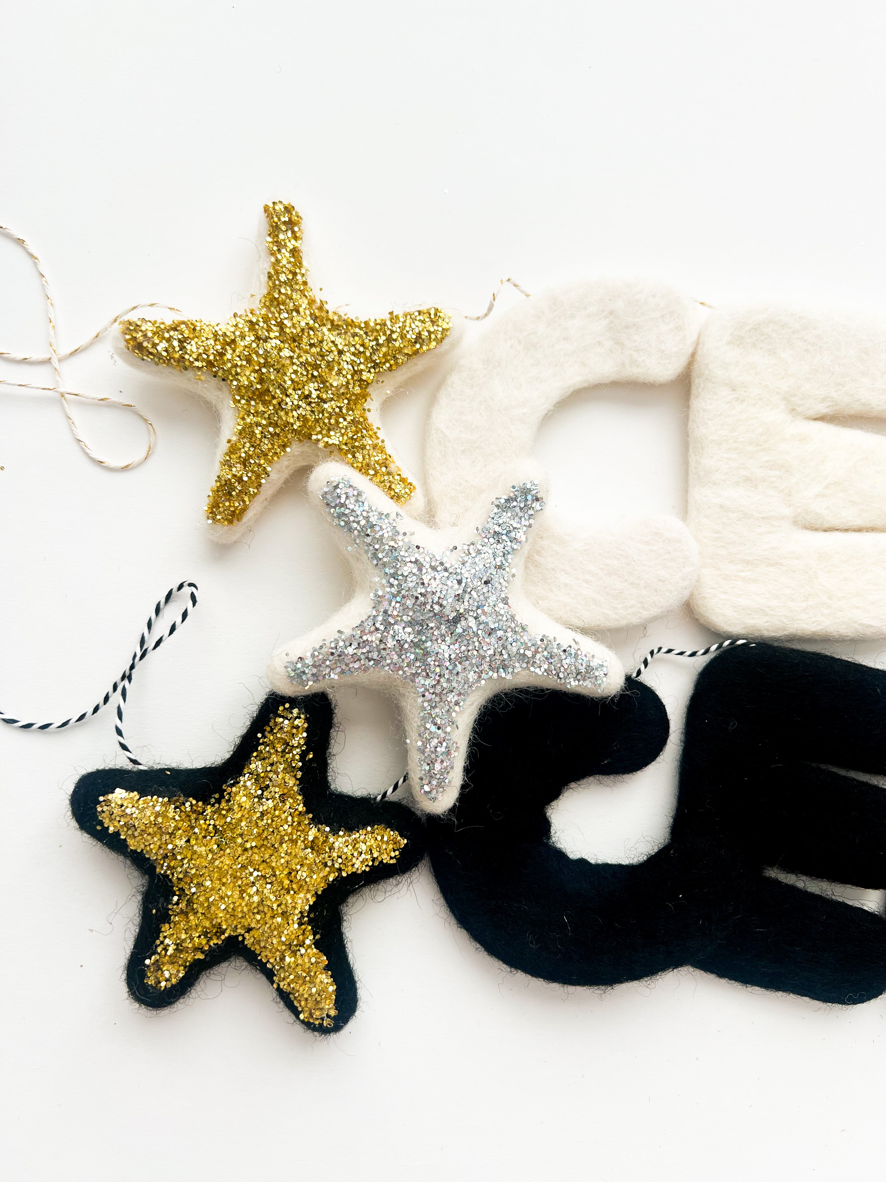 -Letters and Felt Shapes come on 6 ft of coordinating twine and can be moved around for desired spacing